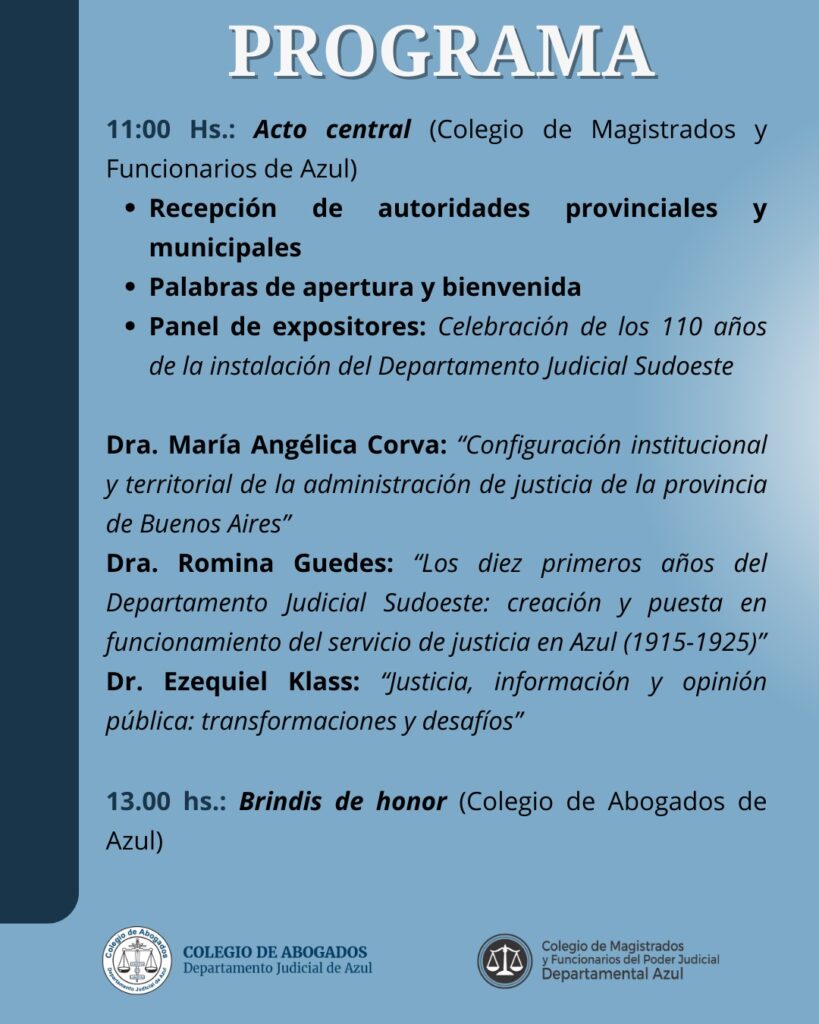 La actividad es organizada por el Colegio de Magistrados y Funcionarios del Departamento Judicial Azul junto al Colegio de Abogados de Azul, instituciones que invitan a la comunidad jurídica a participar de esta celebración que destaca un hito fundamental en la historia institucional de la región y en el fortalecimiento del servicio de justicia en la provincia de Buenos Aires.